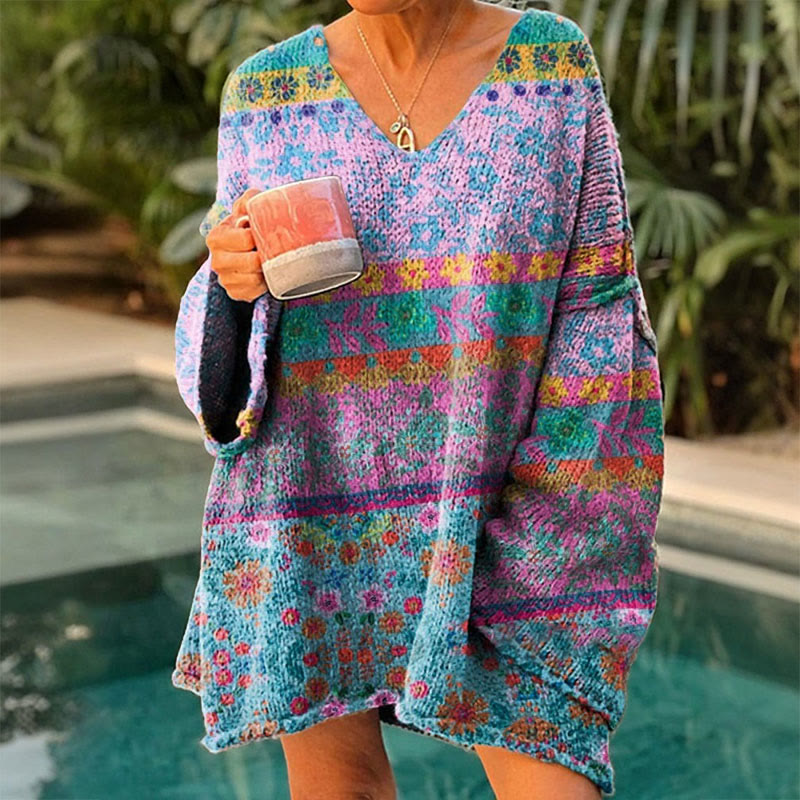 Women's Retro Ethnic Totem Print Causal V-neck Pullover Sweater