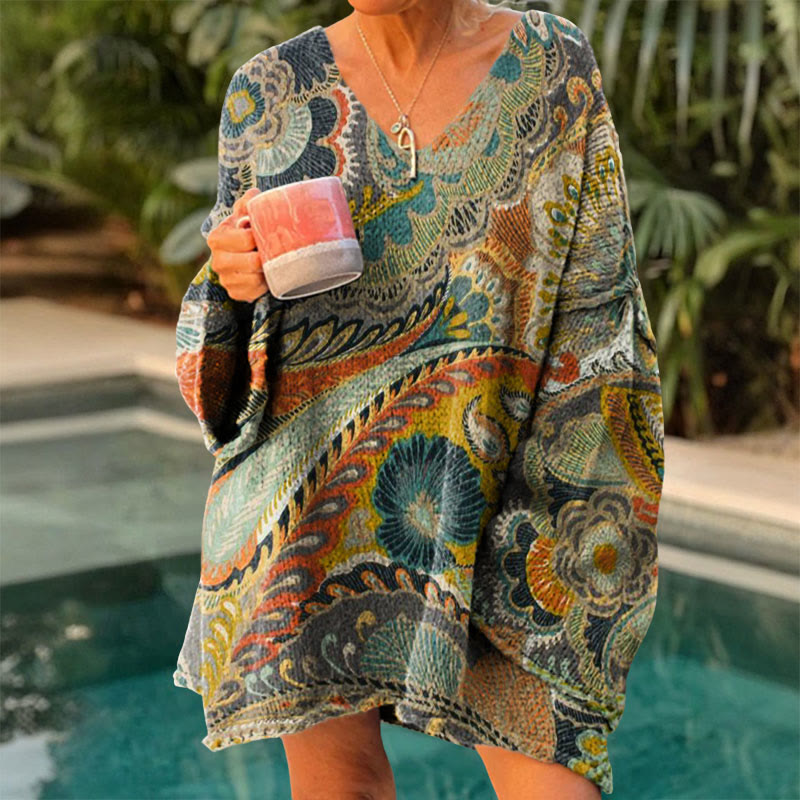 Women's Retro Paisley Print Causal V-neck Pullover Sweater