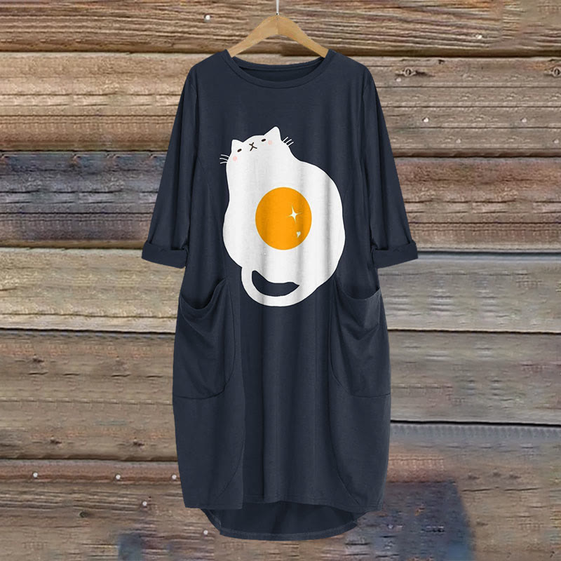 Dashingsoul Cute Cat Egg Art Print Crew Neck Casual Dress