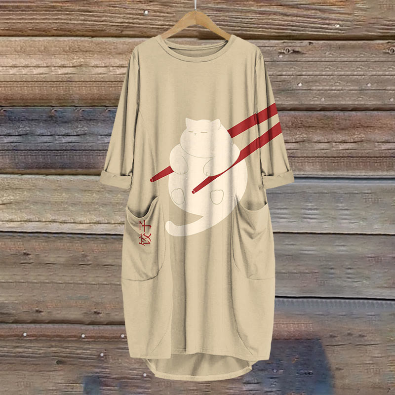 Dashingsoul Cat Dumpling Art Print Crew Neck Casual Dress
