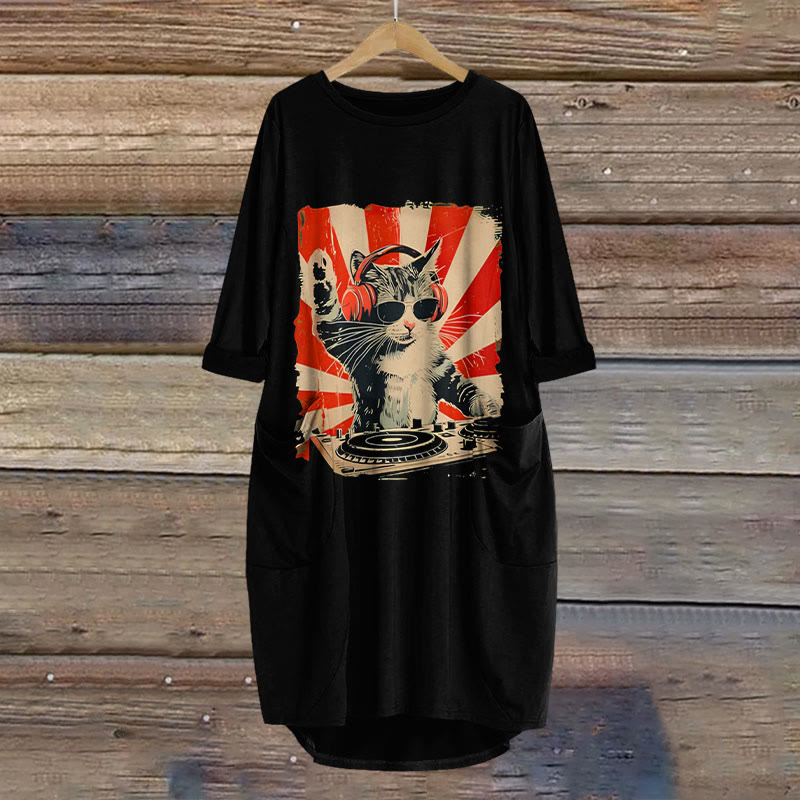 Dashingsoul Dj Cat Print Crew Neck Casual Dress