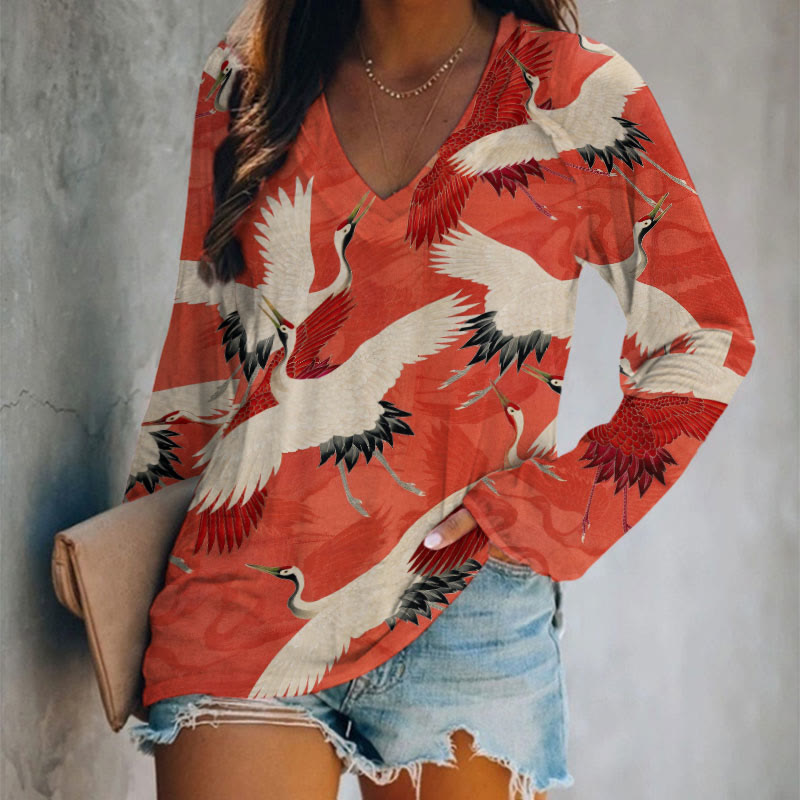 Dashingsoul Japanese Art Vintage Crane Print V-neck Long Sleeve T-shirt