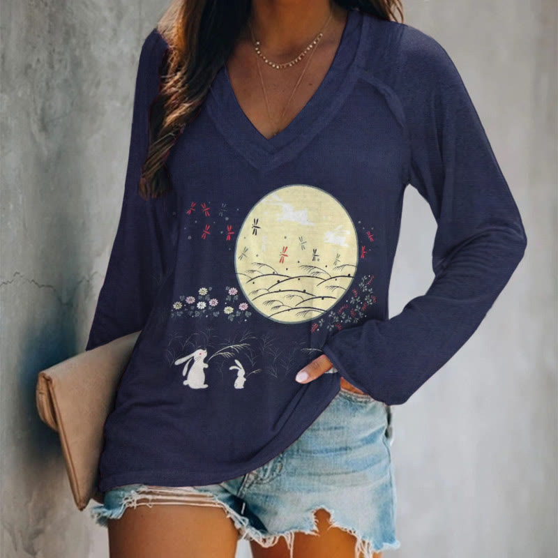 Dashingsoul Japanese Rabbits Moon Otsukimi Print V-neck Long Sleeve T-shirt