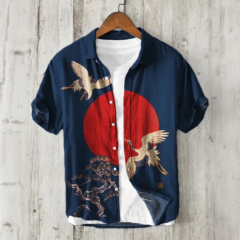 Dashingsoul Cranes & Pine Trees Sunrise Japanese Print Short Sleeve Shirt