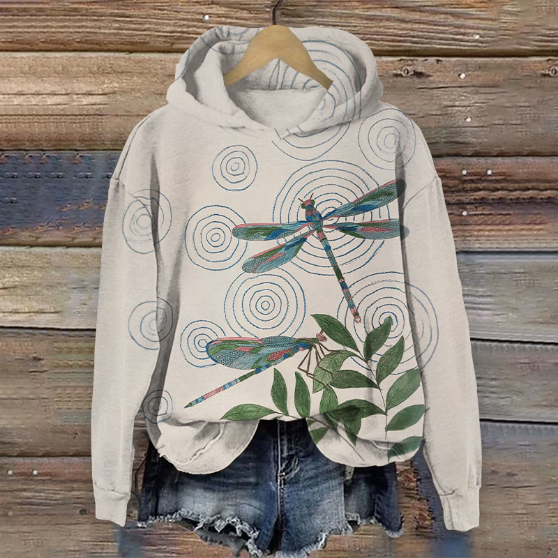 Dashingsoul Retro Japanese Style Water Ripple Dragonfly Print Casual Long Sleeve Hoodie