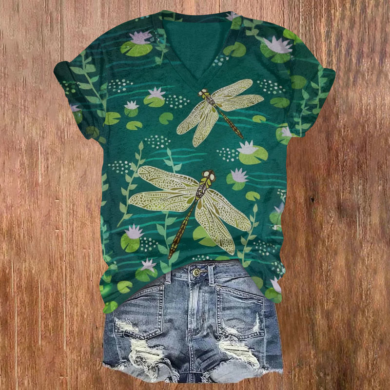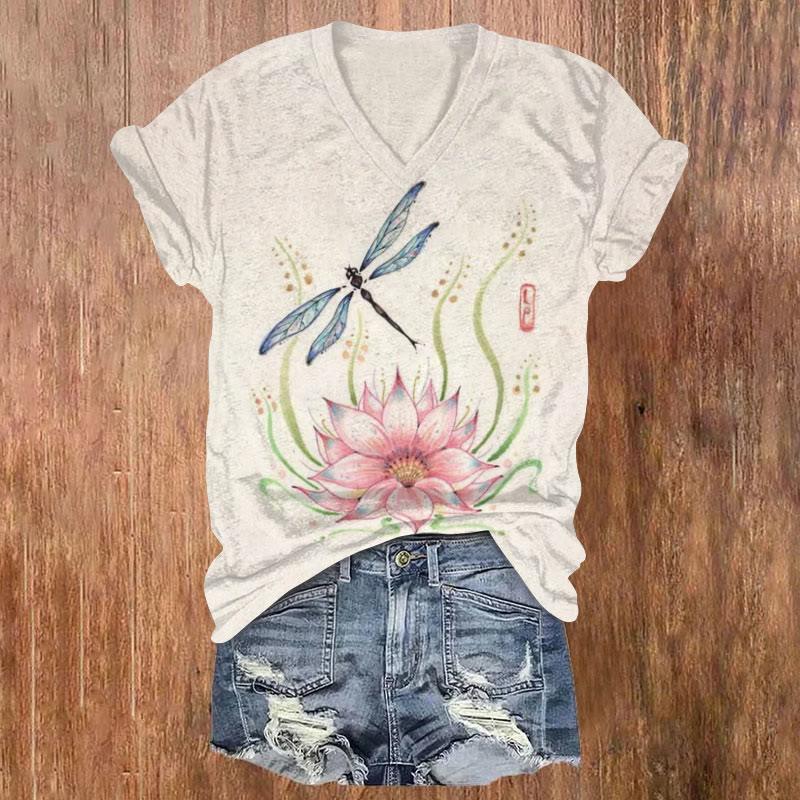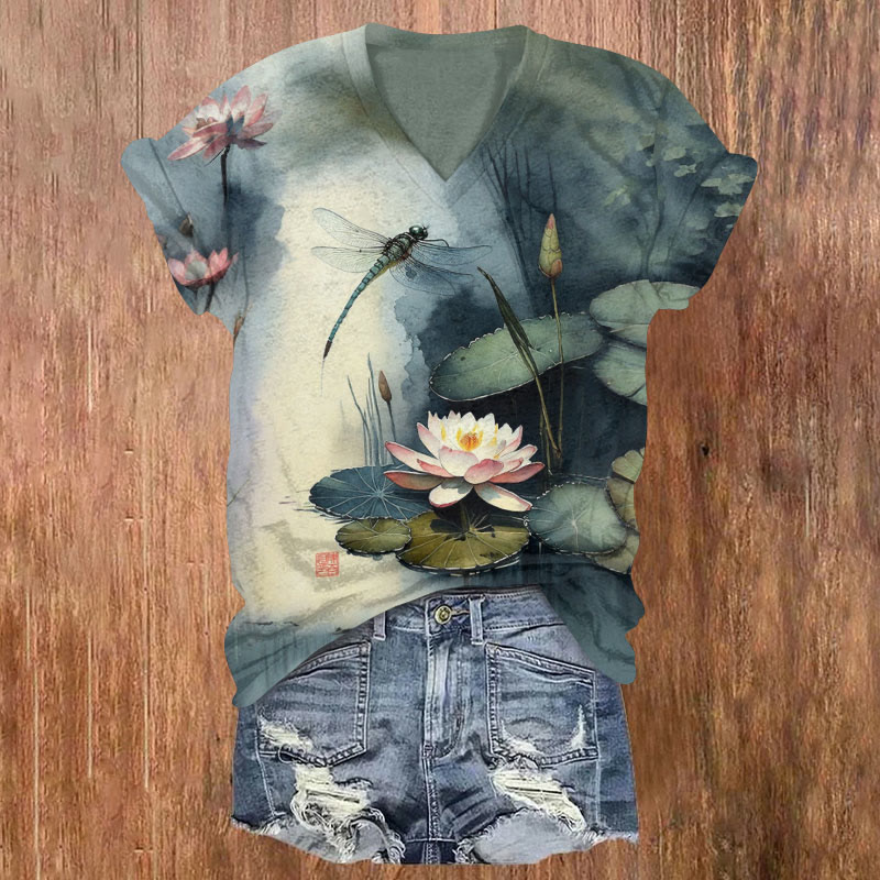 Dashingsoul Lotus Pond Dragonfly Print V-neck T-shirt