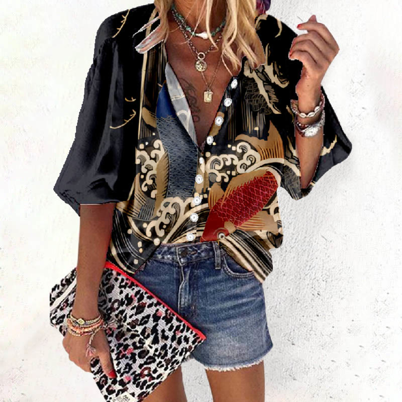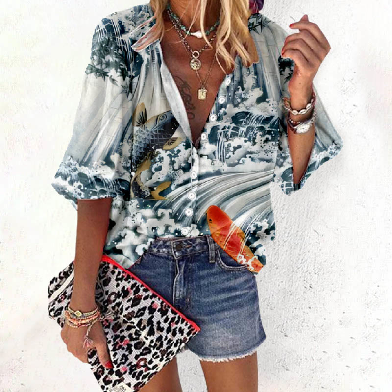 Dashingsoul Women's Japanese Koi Art Print Casual 3/4 Sleeve Blouse