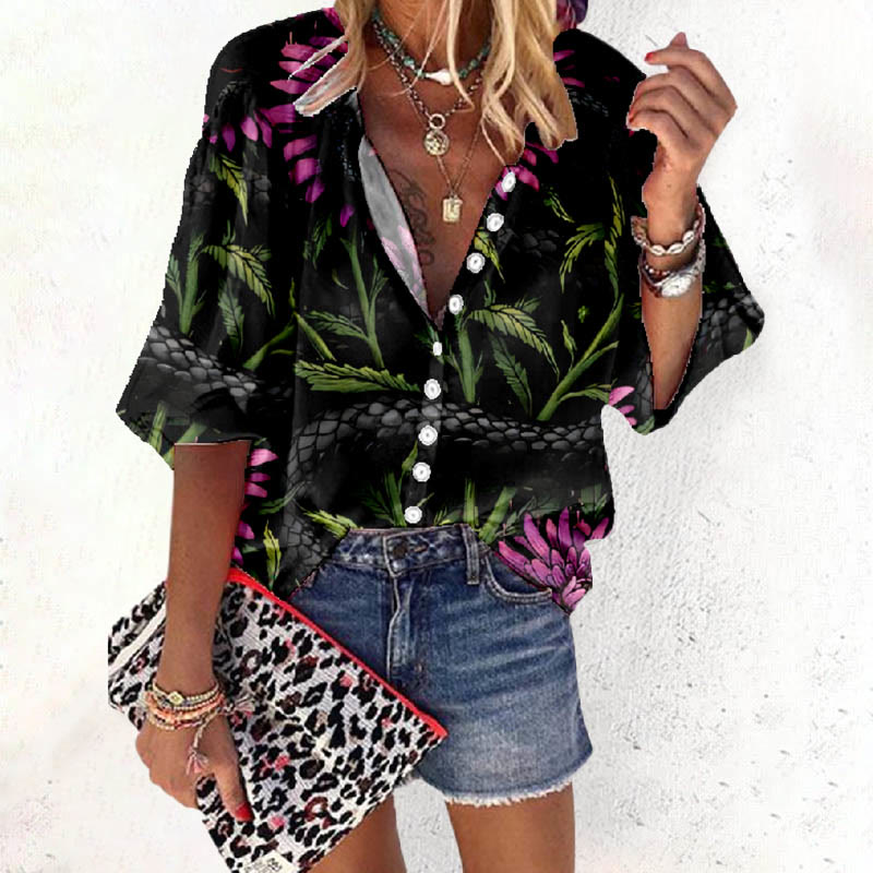 Dashingsoul Women's Vintage Flowers And Leaves Art Print Casual 3/4 Sleeve Blouse