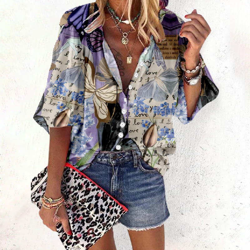 Dashingsoul Women's Colorful Butterfly Collecting Nectar Print Casual 3/4 Sleeve Blouse