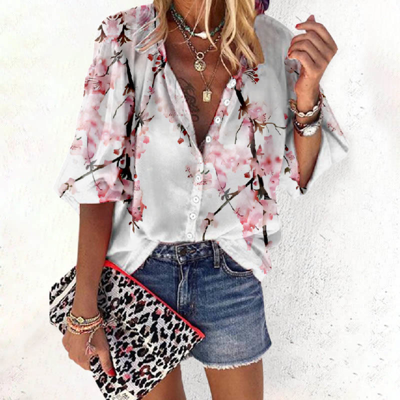 Dashingsoul Women's Japanese Sakura Art Print Casual 3/4 Sleeve Blouse