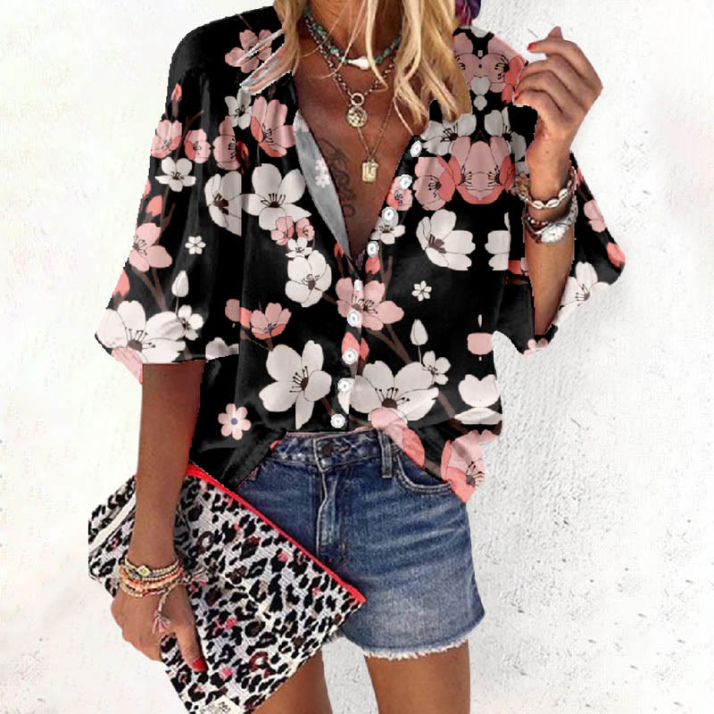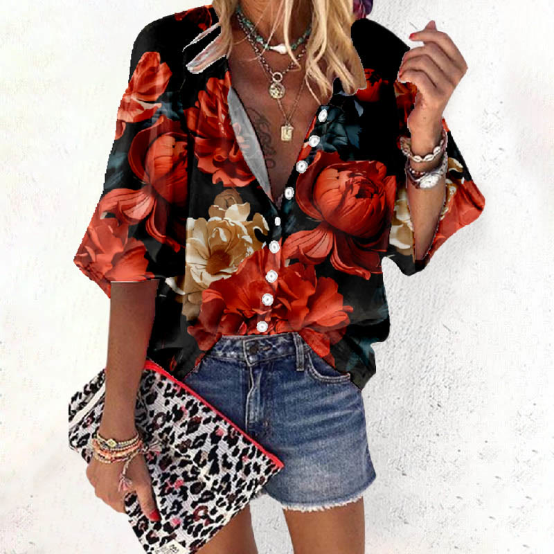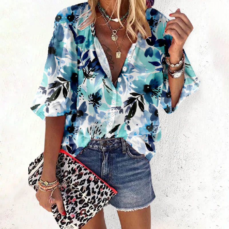 Dashingsoul Women's Romantic Colorful Floral Holiday Print Casual 3/4 Sleeve Blouse