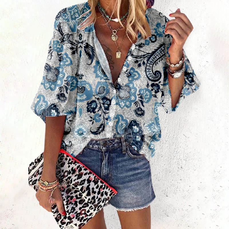 Dashingsoul Women's Vintage Floral Pattern Print Casual 3/4 Sleeve Blouse