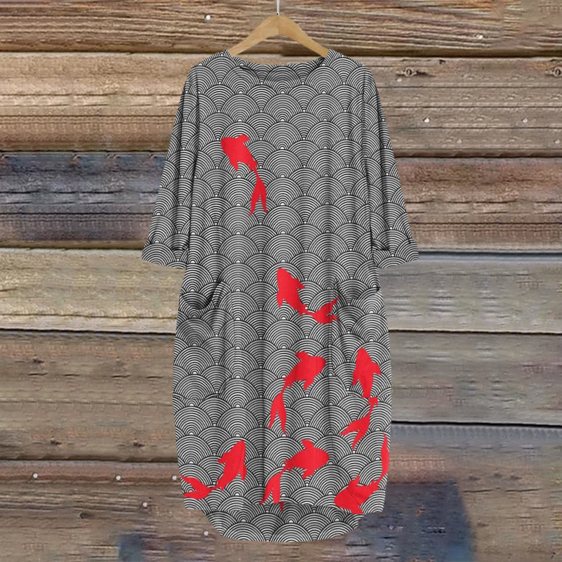 Dashingsoul Women's Japanese Goldfish Art Print Crew Neck Casual Dress