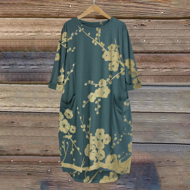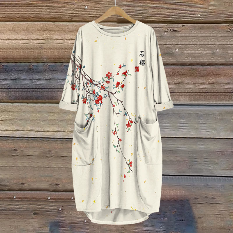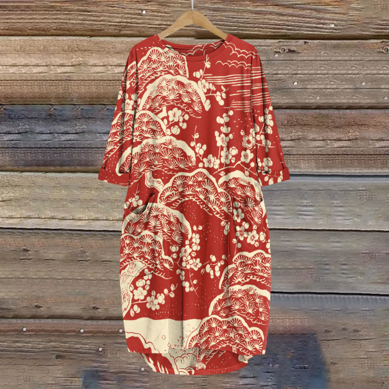 Dashingsoul Women's Japanese Art Plum Blossom Print Crew Neck Casual Dress