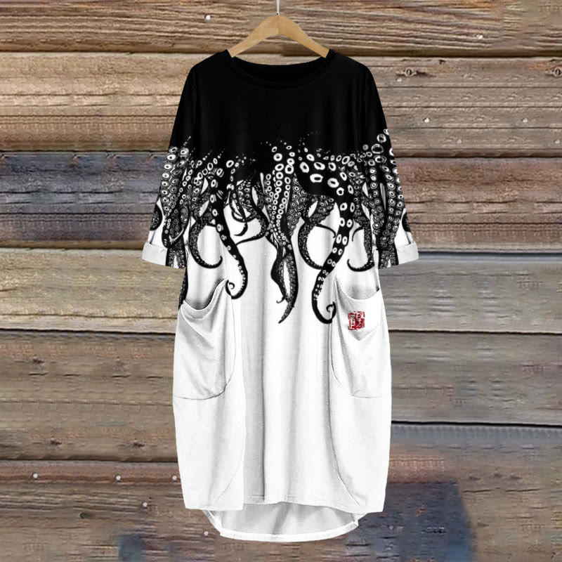 Dashingsoul Women's Black Octopus Art Print Crew Neck Casual Dress