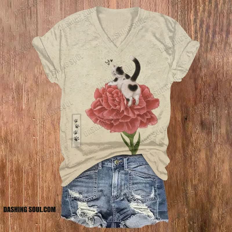 Retro Cute Peony Cat Print V-neck Short-sleeved T-shirt