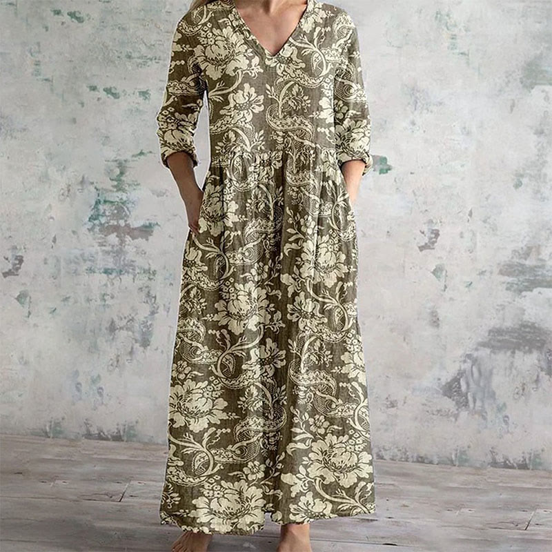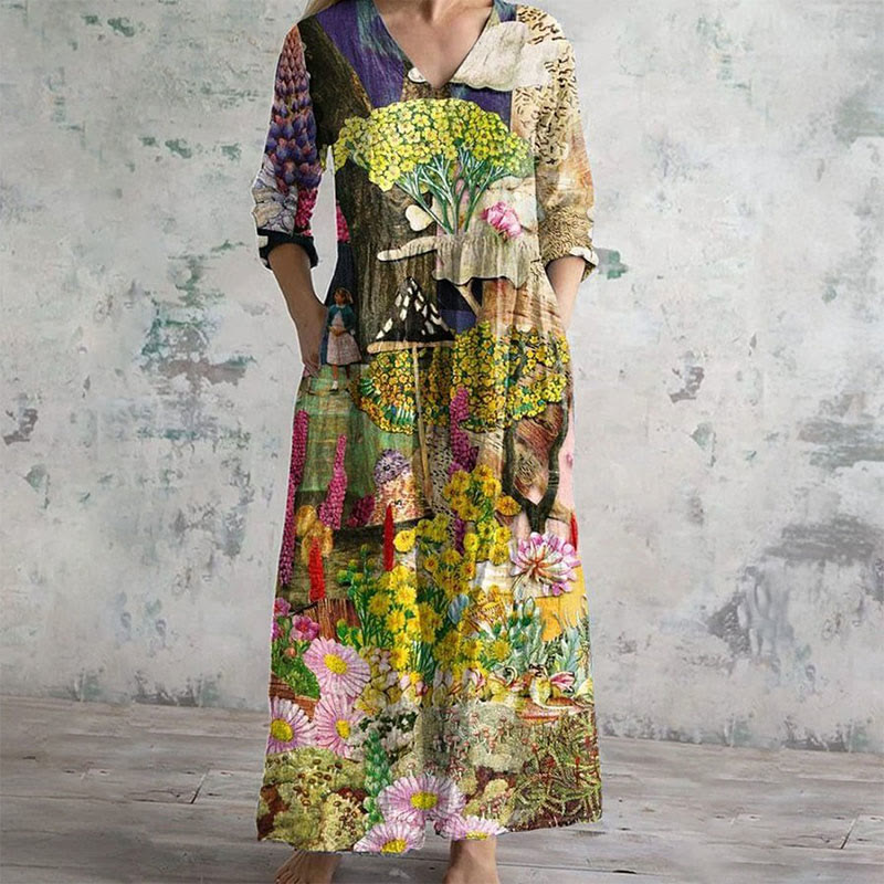 Vintage Floral Patchwork Art Print Casual V-neck Dress