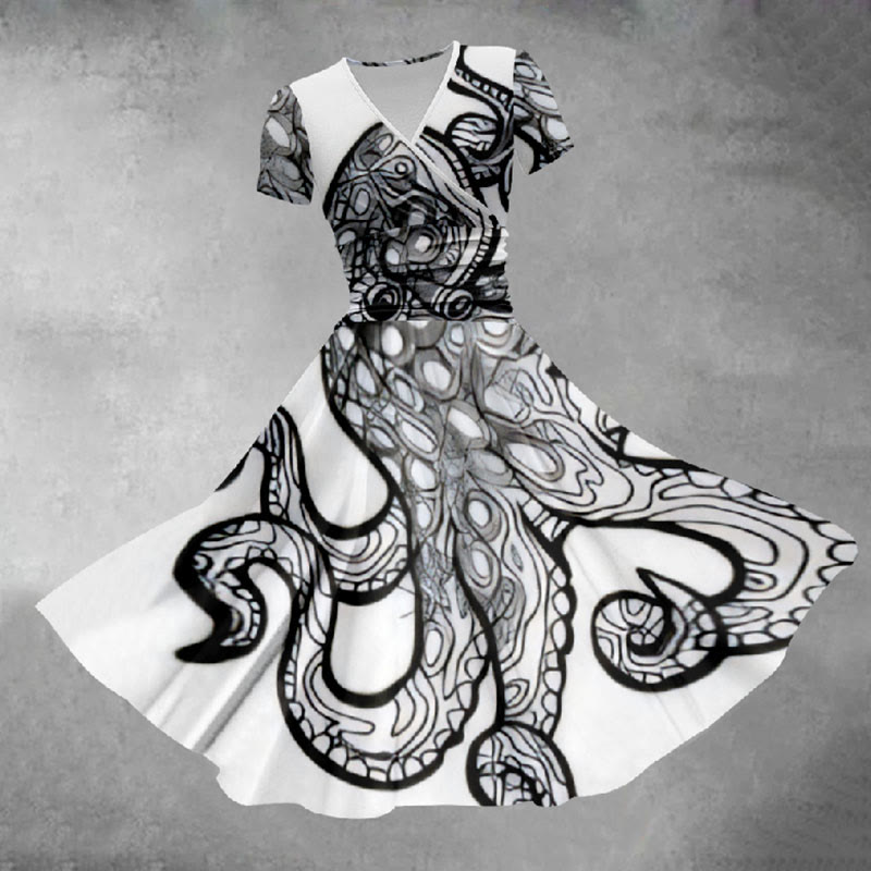 Women's Creative Ink Watercolor Abstract Octopus Print Midi Dress