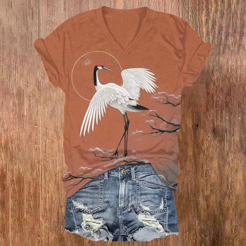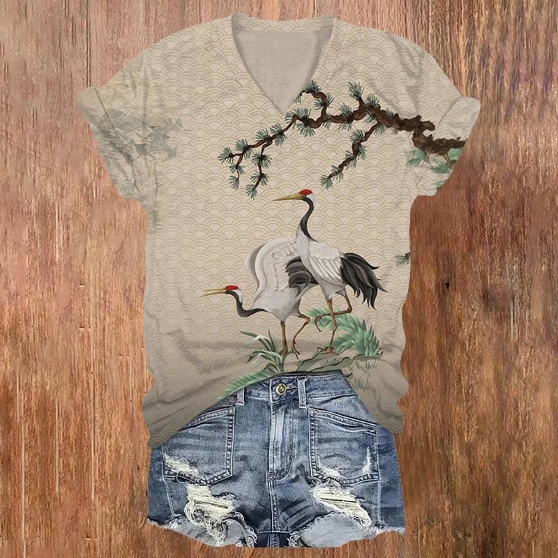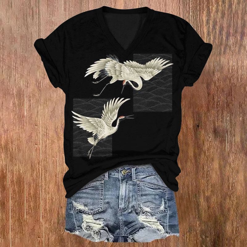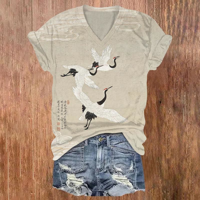 Dashingsoul Japanese Style Flying Cranes Vintage Print V-neck Short-sleeved T-shirt