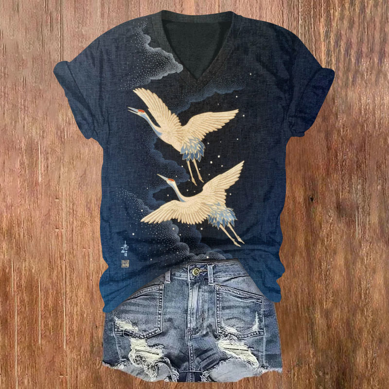 Dashingsoul Japanese Cranes Print V-neck Short-sleeved T-shirt