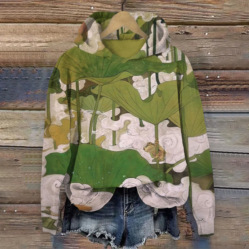 Dashingsoul Retro Cute Frog Lotus Leaf Print Casual Long Sleeve Hoodie