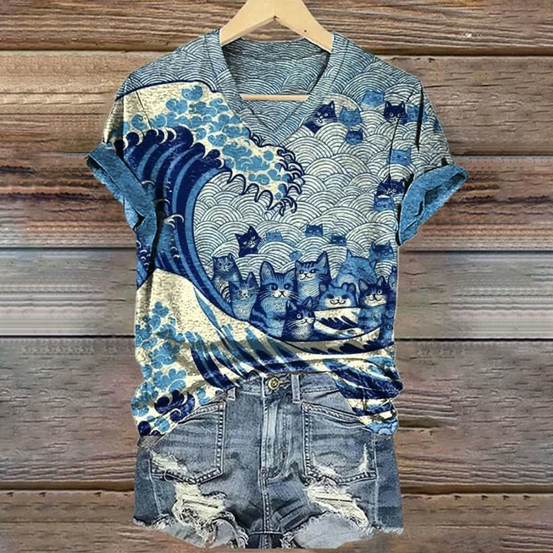 Dashingsoul Blue Waves And Cats Print V-neck Short-sleeved T-shirt