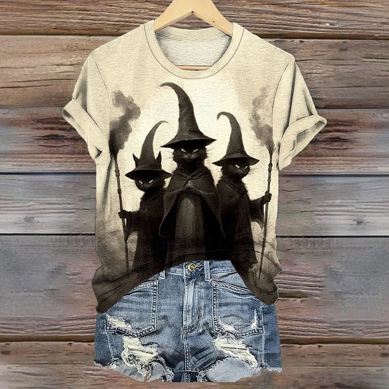 Dashingsoul Women's Witchy Black Cats Print Casual T-shirt