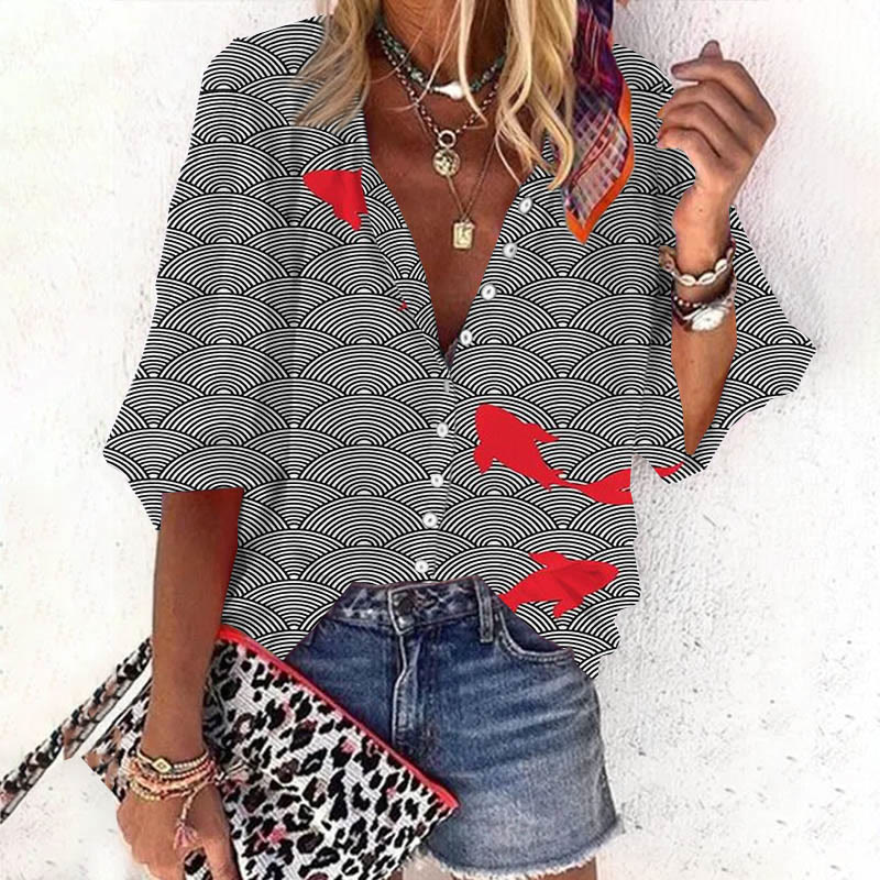 Dashingsoul Women's Japanese Goldfish Art Print Casual 3/4 Sleeve Blouse