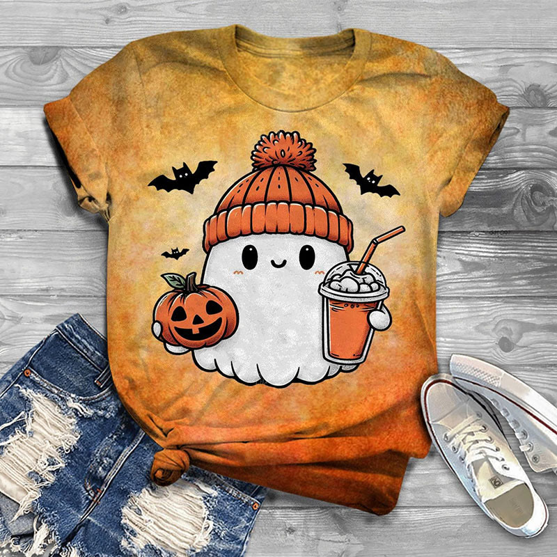 Dashingsoul Cute Ghost Pumpkin Coffee Fall Print Casual T-shirt