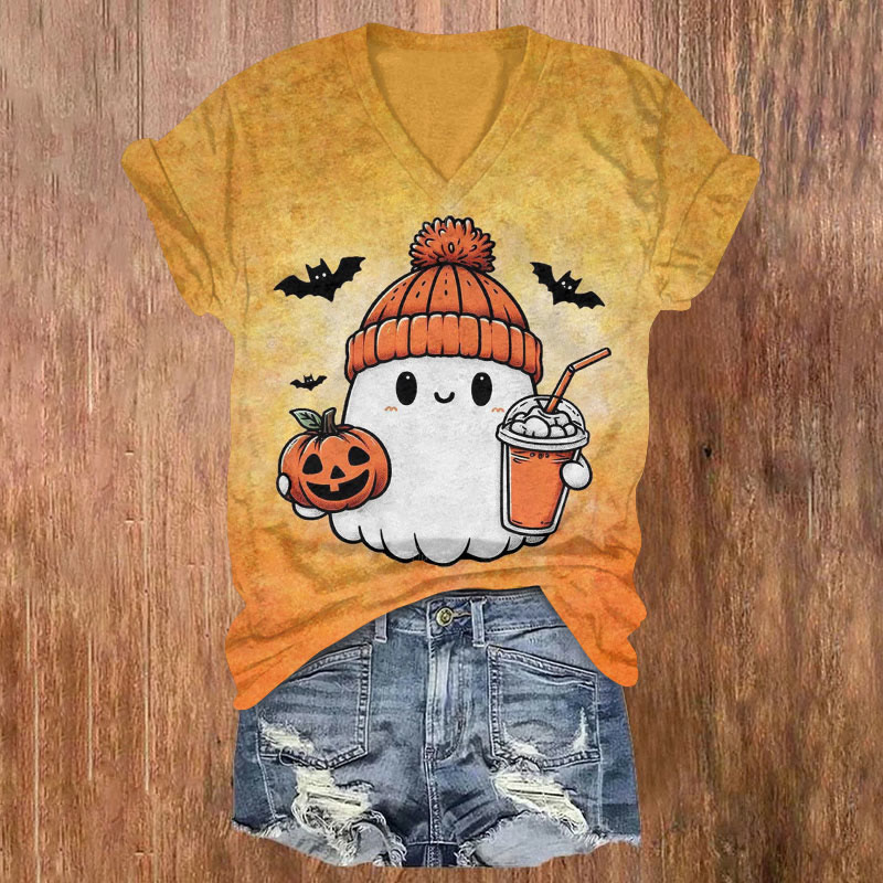 Dashingsoul Cute Ghost Pumpkin Coffee Fall Print V-neck Short-sleeved T-shirt