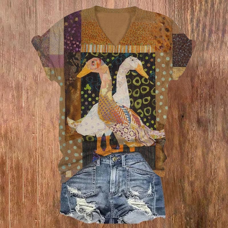 Dashingsoul Vintage Geometric Patchwork Two Ducks Print V-neck T-shirt