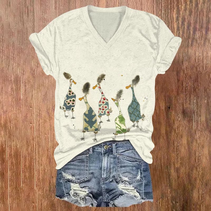 Dashingsoul A Group Of Ducks With Flowers On Their Bodies Print V-neck T-shirt