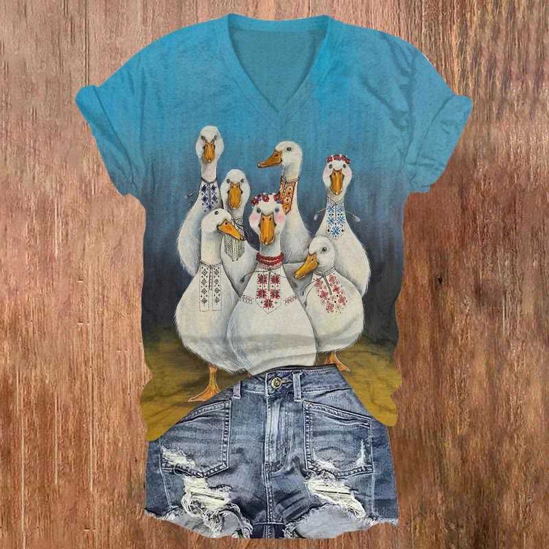 Dashingsoul A Group Of Ducks With Ethnic Flowers On Their Necks Print V-neck T-shirt