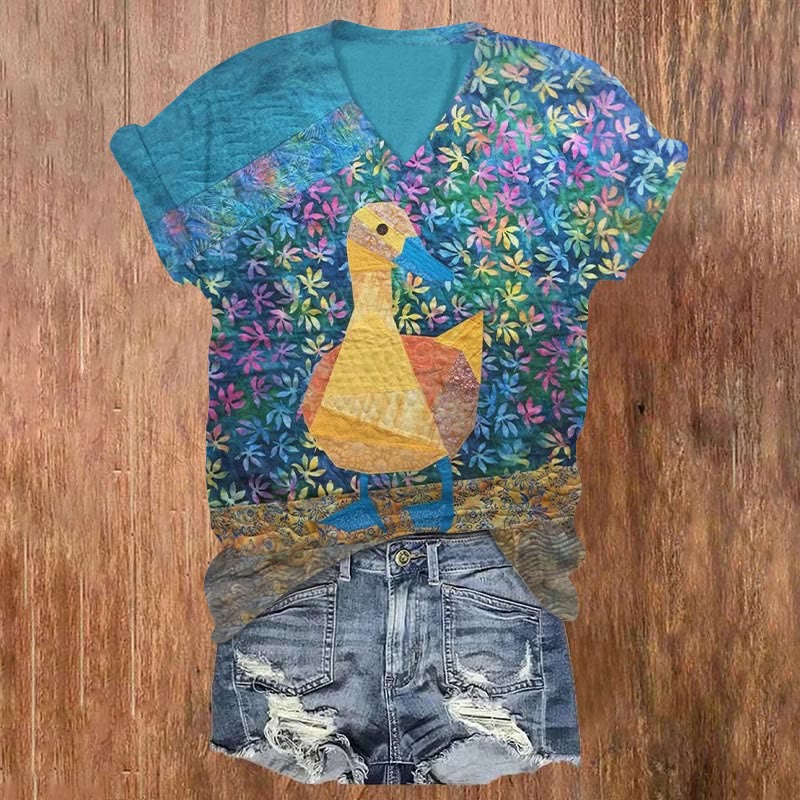 Dashingsoul Vintage Floral Patchwork Duck Print V-neck T-shirt