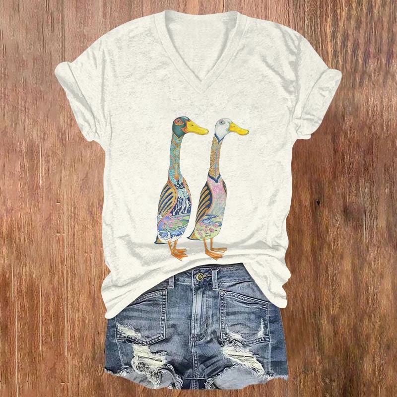 Dashingsoul Two Floral Ducks With Feathers On Their Heads Print V-neck T-shirt