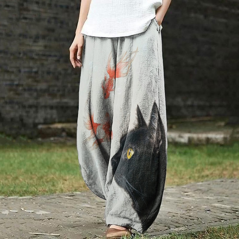 Dashingsoul Cute Black Cat And Goldfish Print Casual Pants