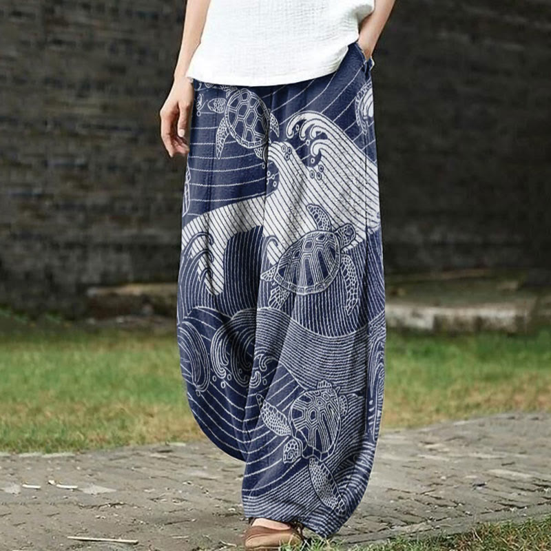 Dashingsoul Retro Ukiyo-e Line Wave Sea Turtle Japanese Art Print Casual Pants