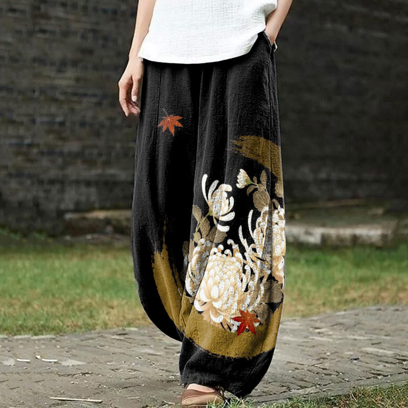 Dashingsoul Chrysanthemum Maple Leaf Japanese Art Print Casual Pants