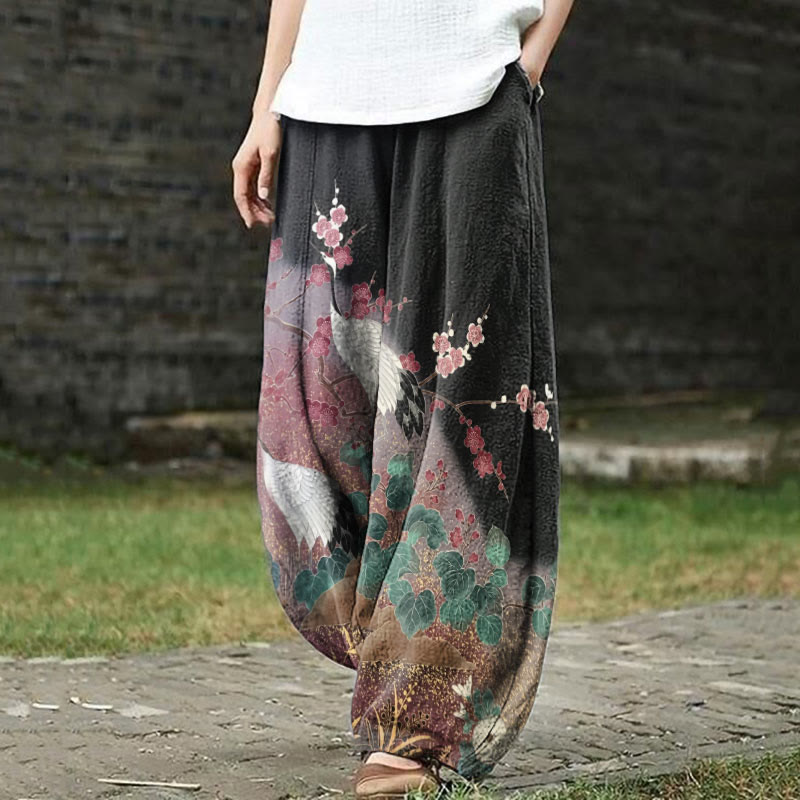Dashingsoul Japanese Retro Crane Art Print Casual Pants
