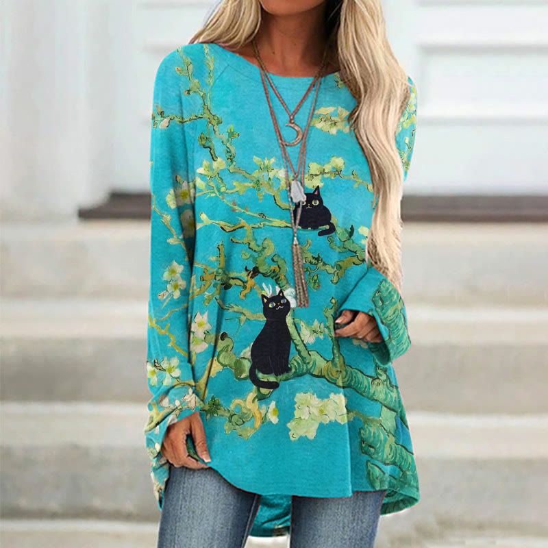 Dashingsoul Van Gogh Almond Blossoms Cat Art Print Casual Tunic