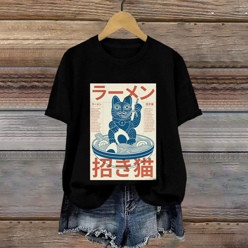 Dashingsoul Cotton Ramen And Fortune Cat Print T-shirt