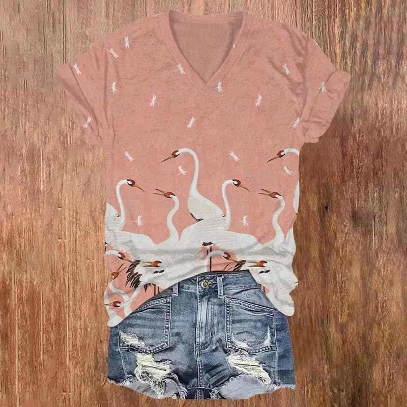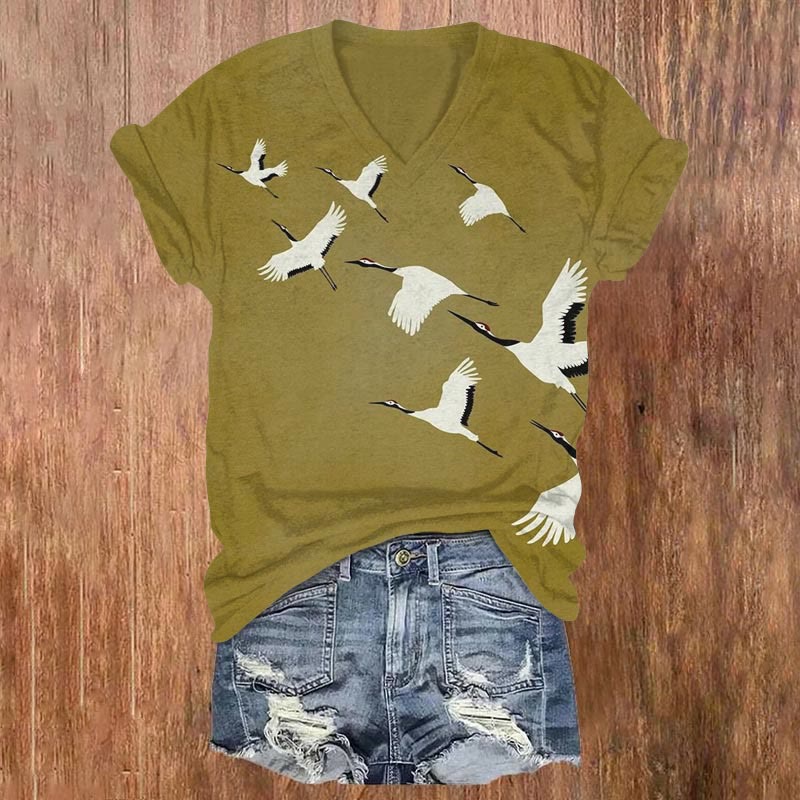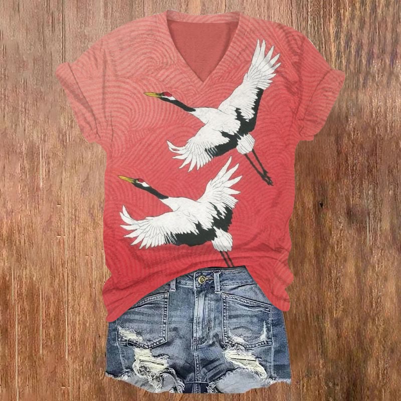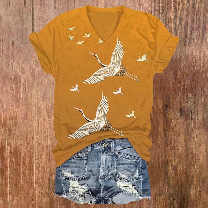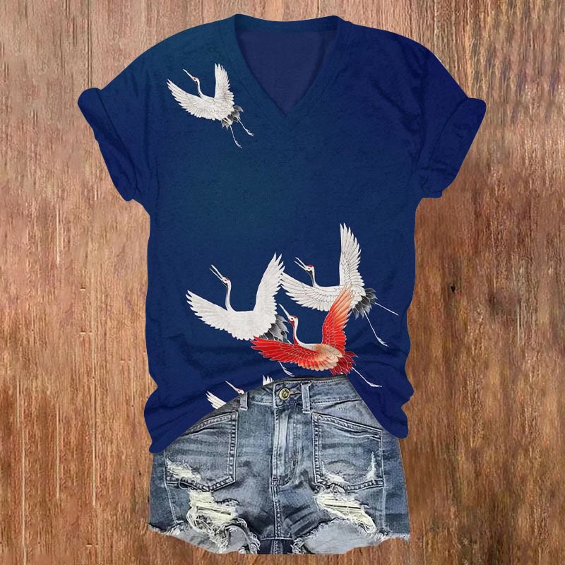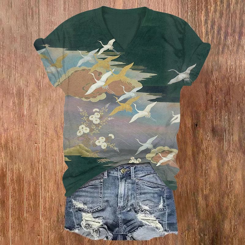 Dashingsoul Japanese Style Flying Cranes Print V-neck Short-sleeved T-shirt