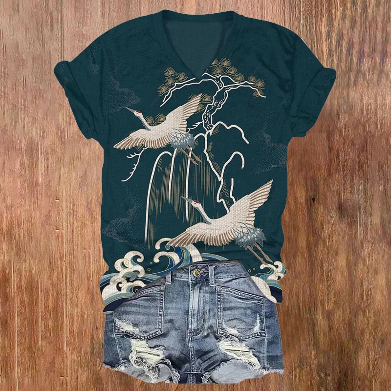 Dashingsoul Japanese Vintage Flying Cranes Print V-neck Short-sleeved T-shirt