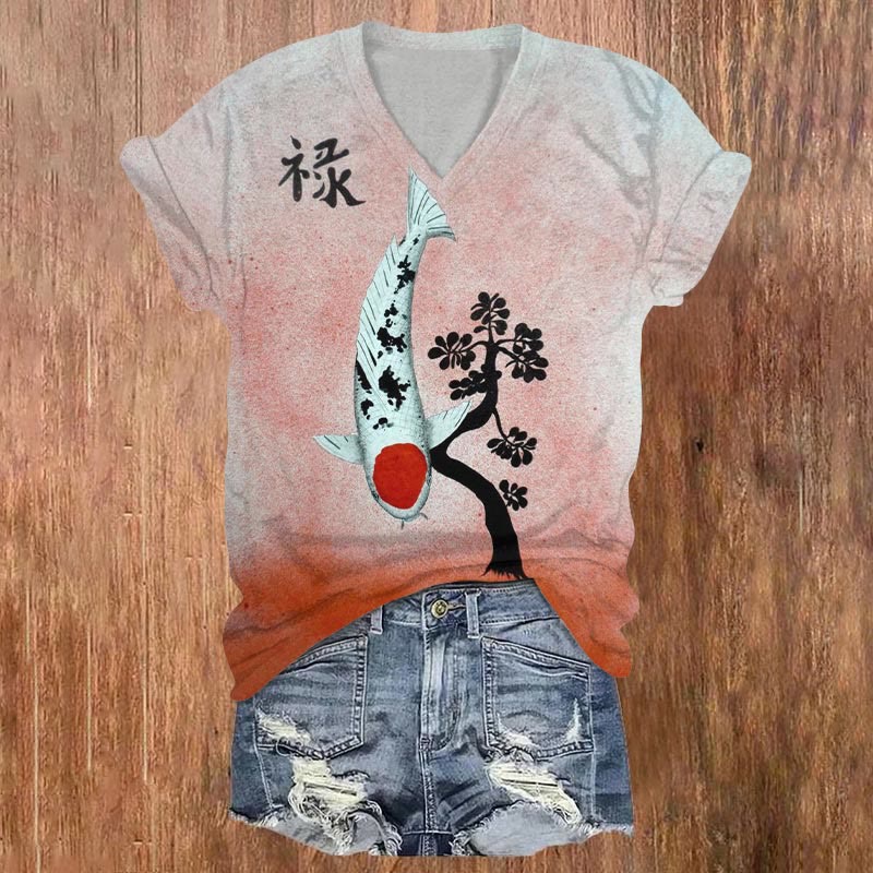 Dashingsoul Japanese Style Koi Print V-neck Short-sleeved T-shirt