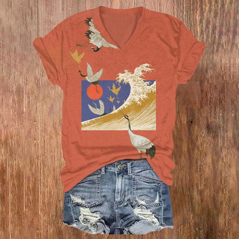 Dashingsoul Japanese Style Wave Illustration Crane Print V-neck Short-sleeved T-shirt
