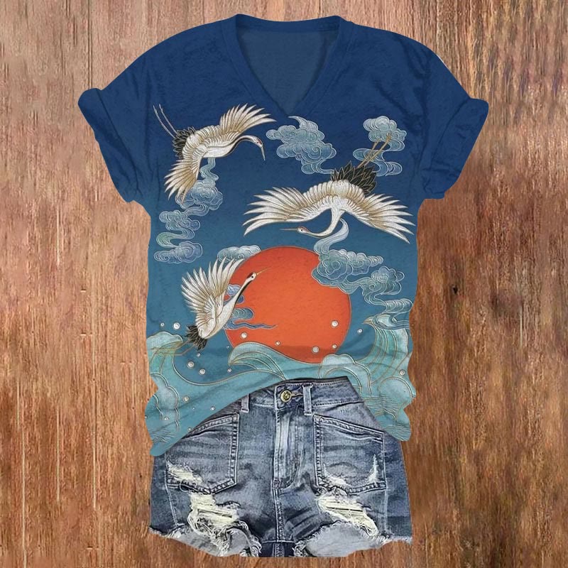 Dashingsoul Japanese Wave Cloud Crane Print V-neck Short-sleeved T-shirt