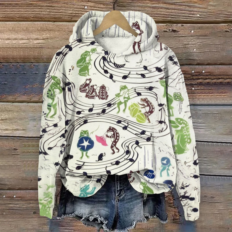 Dashingsoul Japanese Cute Frog Morning Glory Music Party Print Casual Long Sleeve Hoodie