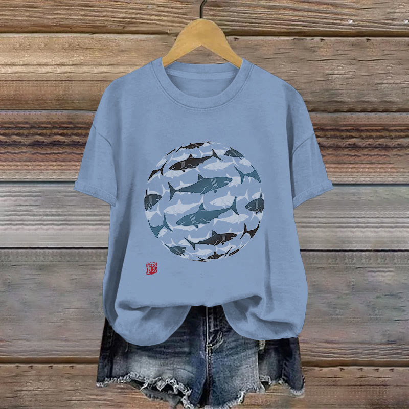 Dashingsoul Swimming Blue Sharks Around The Globe Art Print Casual T-shirt