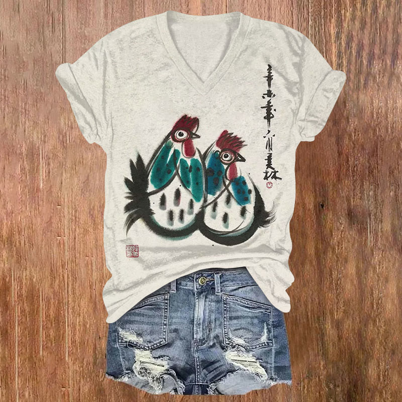 Dashingsoul Vintage Pair Of Roosters Ink Painting Art Print V-neck Causal T-shirt