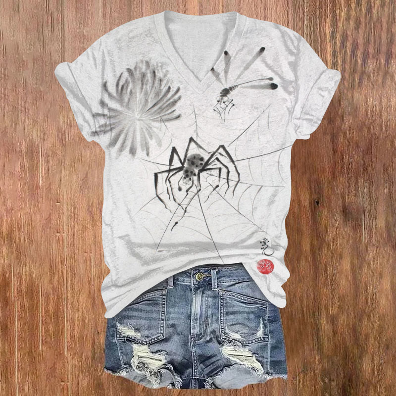 Dashingsoul Vintage Spider Dragonfly Japanese Ink Painting Art Print V-neck Causal T-shirt